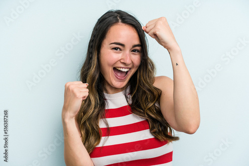 Young caucasian woman isolated on blue background cheering carefree and excited. Victory concept.