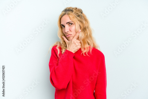 Young caucasian woman isolated on blue background contemplating, planning a strategy, thinking about the way of a business.