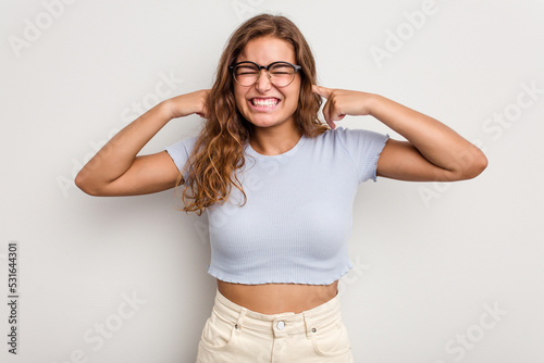 Young caucasian woman isolated on blue background covering ears with fingers, stressed and desperate by a loudly ambient.