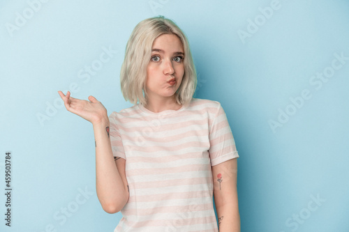 Young caucasian woman isolated on blue background doubting and shrugging shoulders in questioning gesture.