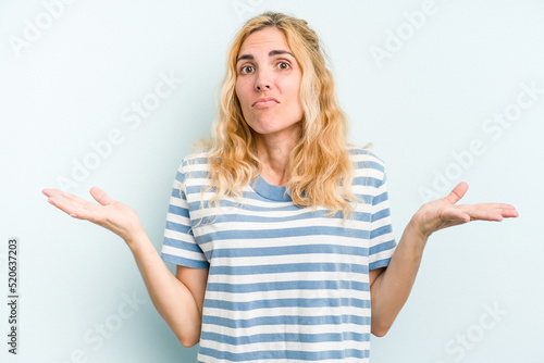 Young caucasian woman isolated on blue background doubting and shrugging shoulders in questioning gesture.