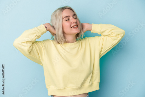 Young caucasian woman isolated on blue background feeling confident, with hands behind the head.