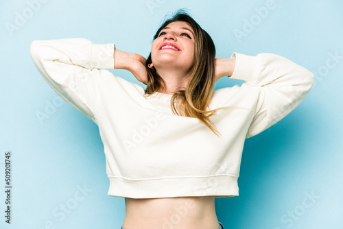 Young caucasian woman isolated on blue background feeling confident, with hands behind the head.