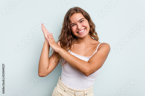 Young caucasian woman isolated on blue background feeling energetic and comfortable, rubbing hands confident.