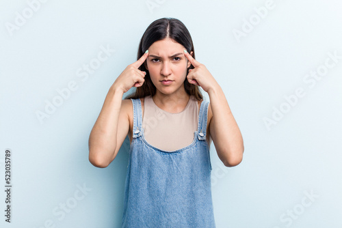 Young caucasian woman isolated on blue background focused on a task, keeping forefingers pointing head.