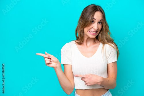 Young caucasian woman isolated on blue background frightened and pointing to the side