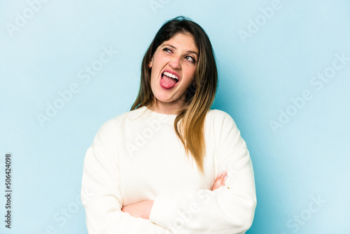 Young caucasian woman isolated on blue background funny and friendly sticking out tongue.