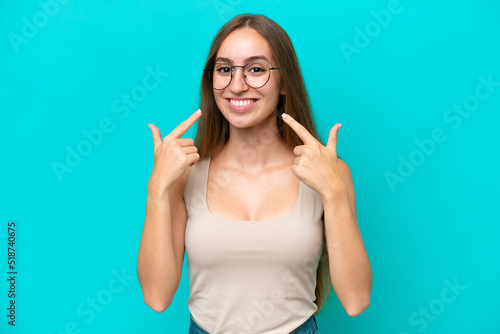 Young caucasian woman isolated on blue background giving a thumbs up gesture