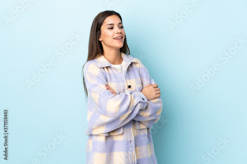 Young caucasian woman isolated on blue background happy and smiling