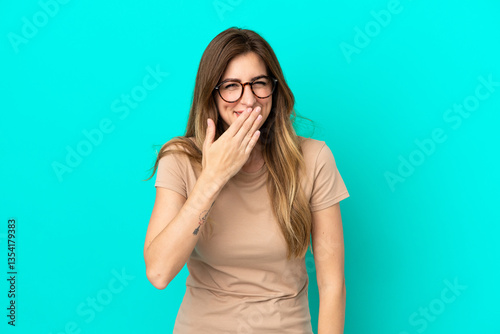 Young caucasian woman isolated on blue background happy and smiling covering mouth with hand