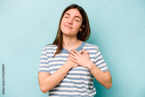 Young caucasian woman isolated on blue background has friendly expression, pressing palm to chest. Love concept.