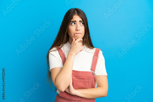 Young caucasian woman isolated on blue background having doubts and thinking