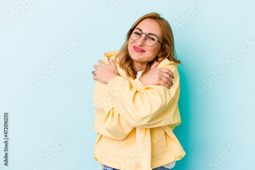 Young caucasian woman isolated on blue background hugs, smiling carefree and happy.
