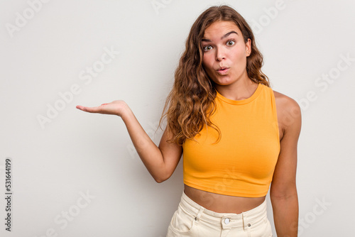 Young caucasian woman isolated on blue background impressed holding copy space on palm.