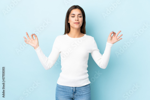 Young caucasian woman isolated on blue background in zen pose