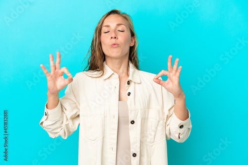 Young caucasian woman isolated on blue background in zen pose