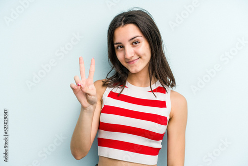 Young caucasian woman isolated on blue background joyful and carefree showing a peace symbol with fingers.