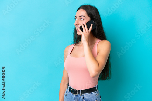 Young caucasian woman isolated on blue background keeping a conversation with the mobile phone with someone