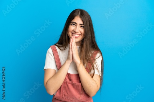 Young caucasian woman isolated on blue background keeps palm together. Person asks for something