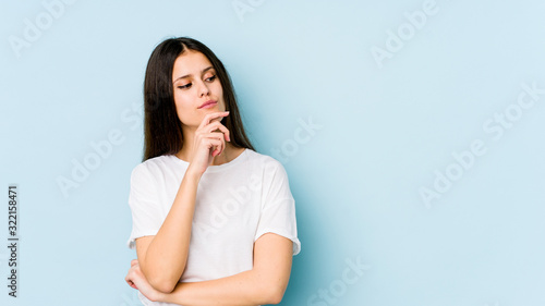Young caucasian woman isolated on blue background looking sideways with doubtful and skeptical expression.