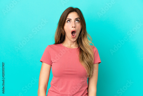 Young caucasian woman isolated on blue background looking up and with surprised expression