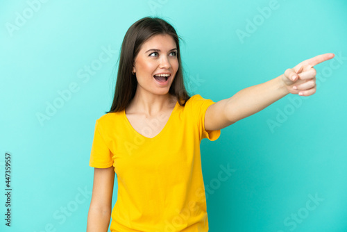 Young caucasian woman isolated on blue background pointing away