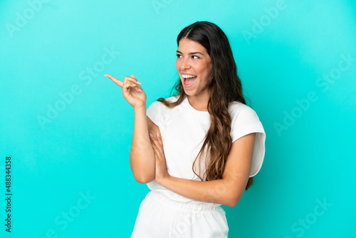 Young caucasian woman isolated on blue background pointing finger to the side and presenting a product