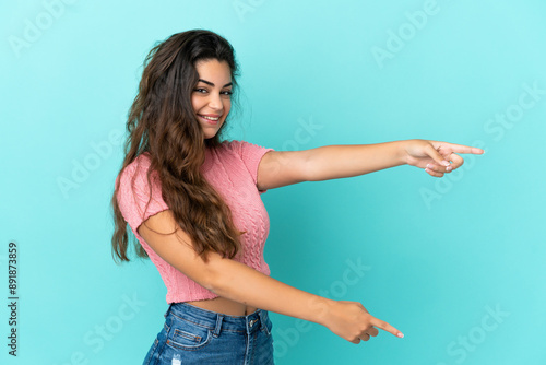 Young caucasian woman isolated on blue background pointing finger to the side and presenting a product
