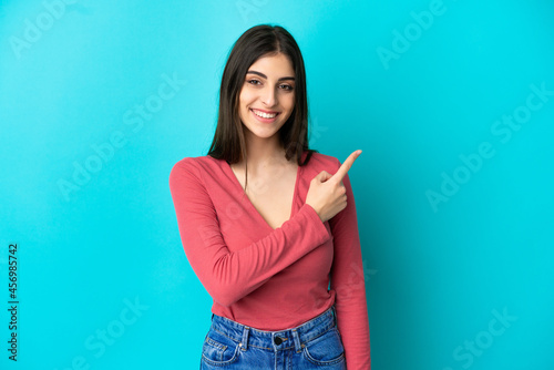 Young caucasian woman isolated on blue background pointing to the side to present a product