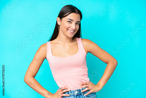 Young caucasian woman isolated on blue background posing with arms at hip and smiling