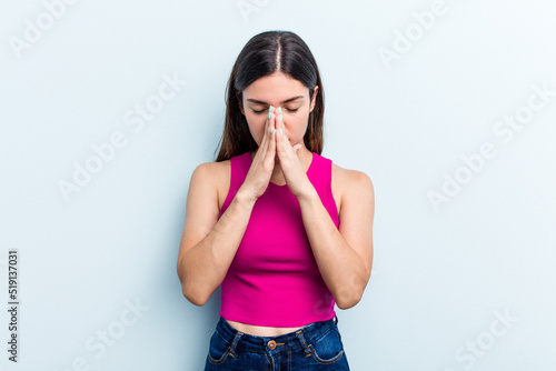 Young caucasian woman isolated on blue background praying, showing devotion, religious person looking for divine inspiration.