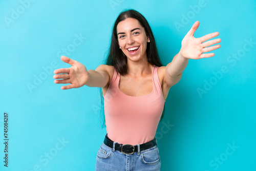 Young caucasian woman isolated on blue background presenting and inviting to come with hand