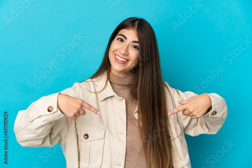 Young caucasian woman isolated on blue background proud and self-satisfied