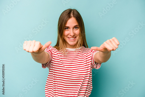 Young caucasian woman isolated on blue background raising both thumbs up, smiling and confident.