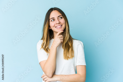 Young caucasian woman isolated on blue background relaxed thinking about something looking at a copy space.