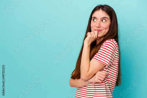 Young caucasian woman isolated on blue background relaxed thinking about something looking at a copy space.