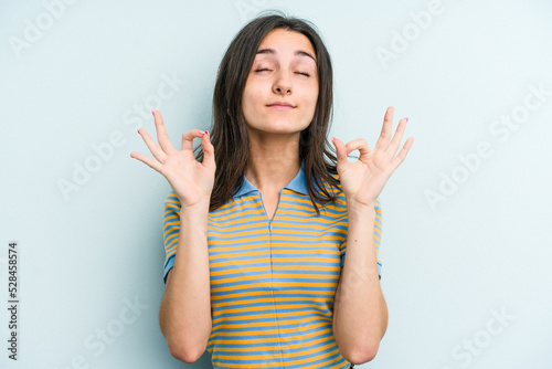 Young caucasian woman isolated on blue background relaxes after hard working day, she is performing yoga.