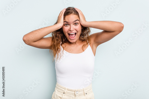 Young caucasian woman isolated on blue background screaming, very excited, passionate, satisfied with something.