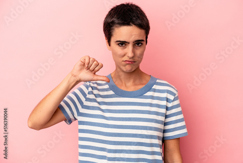 Young caucasian woman isolated on blue background showing a dislike gesture, thumbs down. Disagreement concept.
