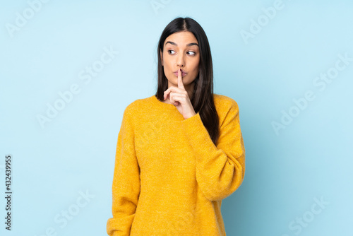 Young caucasian woman isolated on blue background showing a sign of silence gesture putting finger in mouth