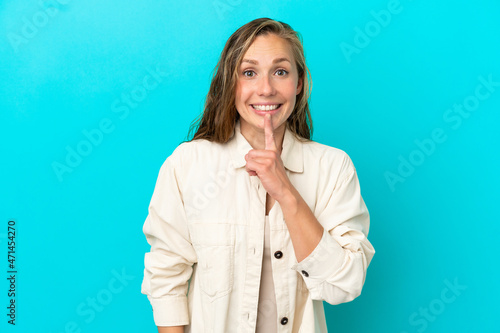 Young caucasian woman isolated on blue background showing a sign of silence gesture putting finger in mouth
