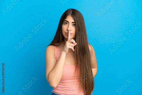 Young caucasian woman isolated on blue background showing a sign of silence gesture putting finger in mouth