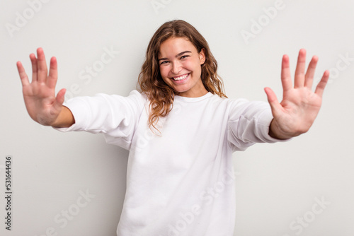 Young caucasian woman isolated on blue background showing number ten with hands.