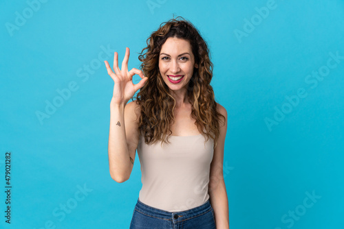 Young caucasian woman isolated on blue background showing ok sign with fingers