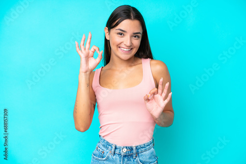 Young caucasian woman isolated on blue background showing ok sign with two hands
