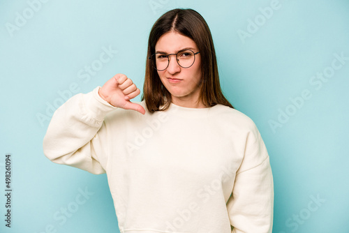 Young caucasian woman isolated on blue background showing thumb down, disappointment concept.