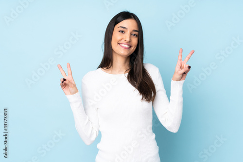 Young caucasian woman isolated on blue background showing victory sign with both hands