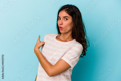 Young caucasian woman isolated on blue background smiling and pointing aside, showing something at blank space.