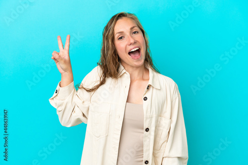 Young caucasian woman isolated on blue background smiling and showing victory sign
