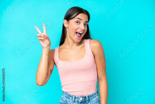 Young caucasian woman isolated on blue background smiling and showing victory sign